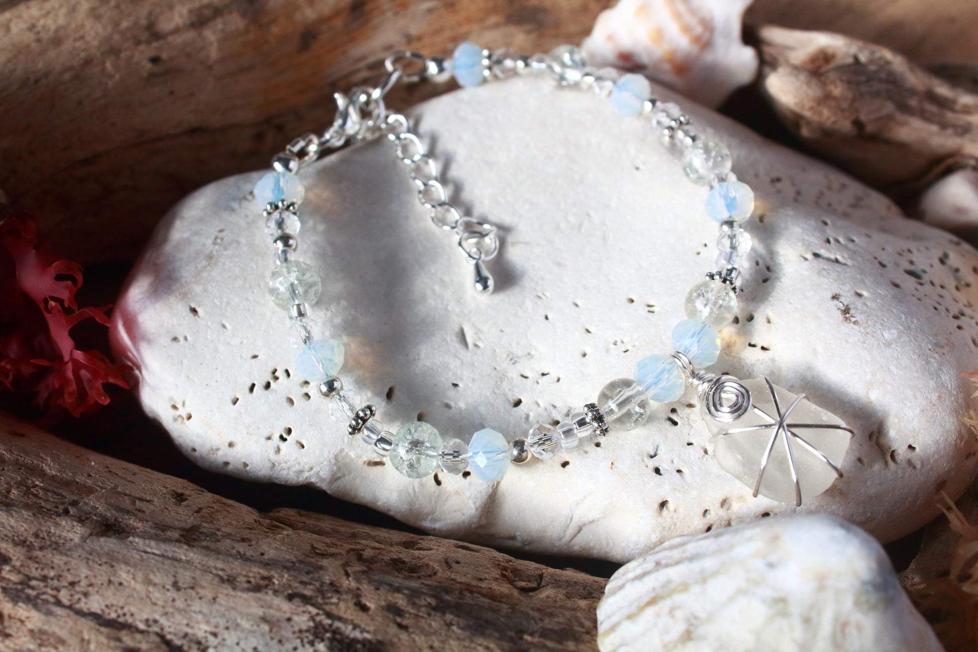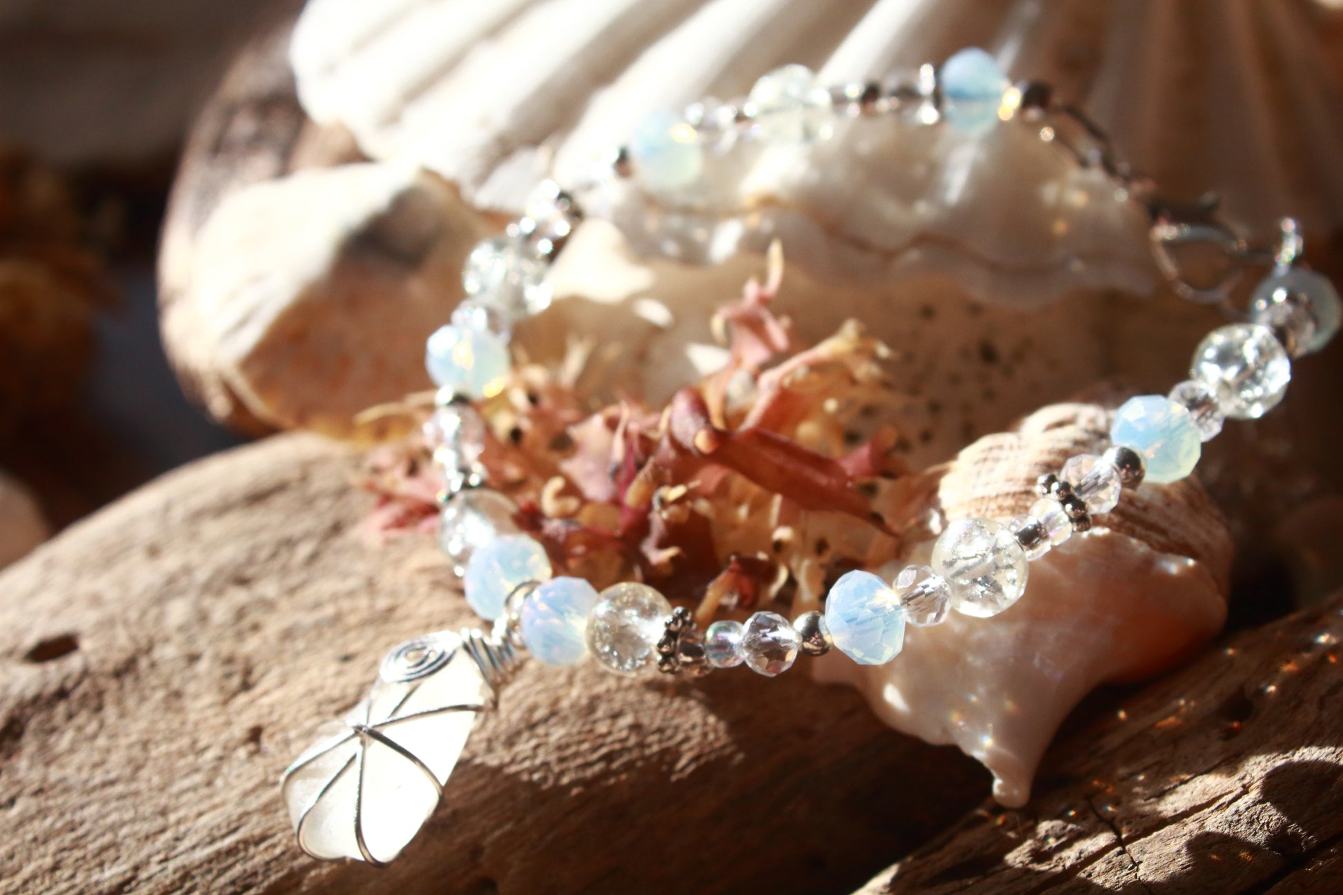 ~ Crystal clear and opal glass beads complimented by a piece of frosted white genuine Irish sea glass, wrapped in silver plated wire with silver tone spacer beads.