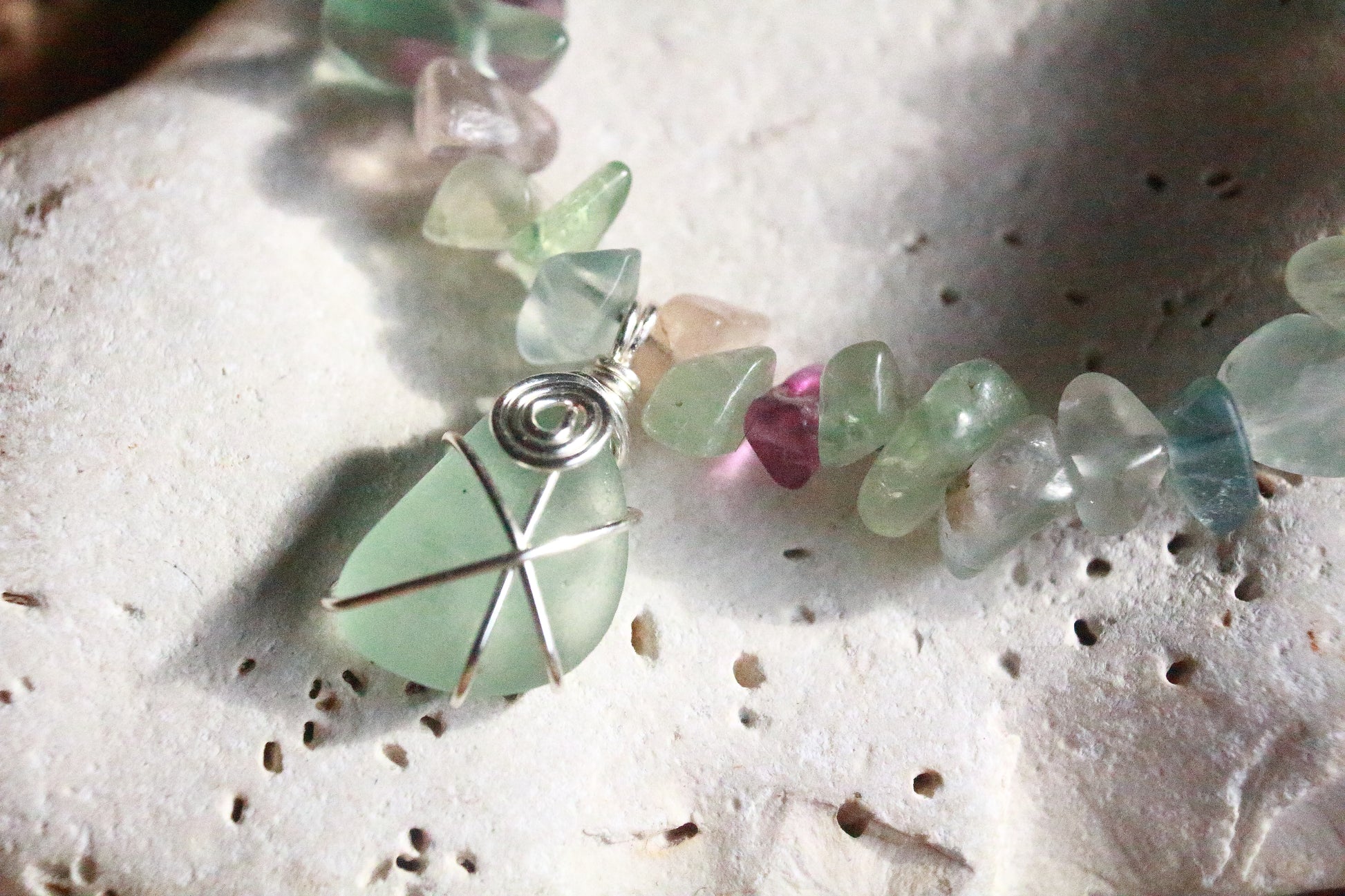 ~ Semi precious rainbow fluorite chips, complimented by a piece of frosted seafoam aqua genuine Irish sea glass, wrapped in silver plated wire.