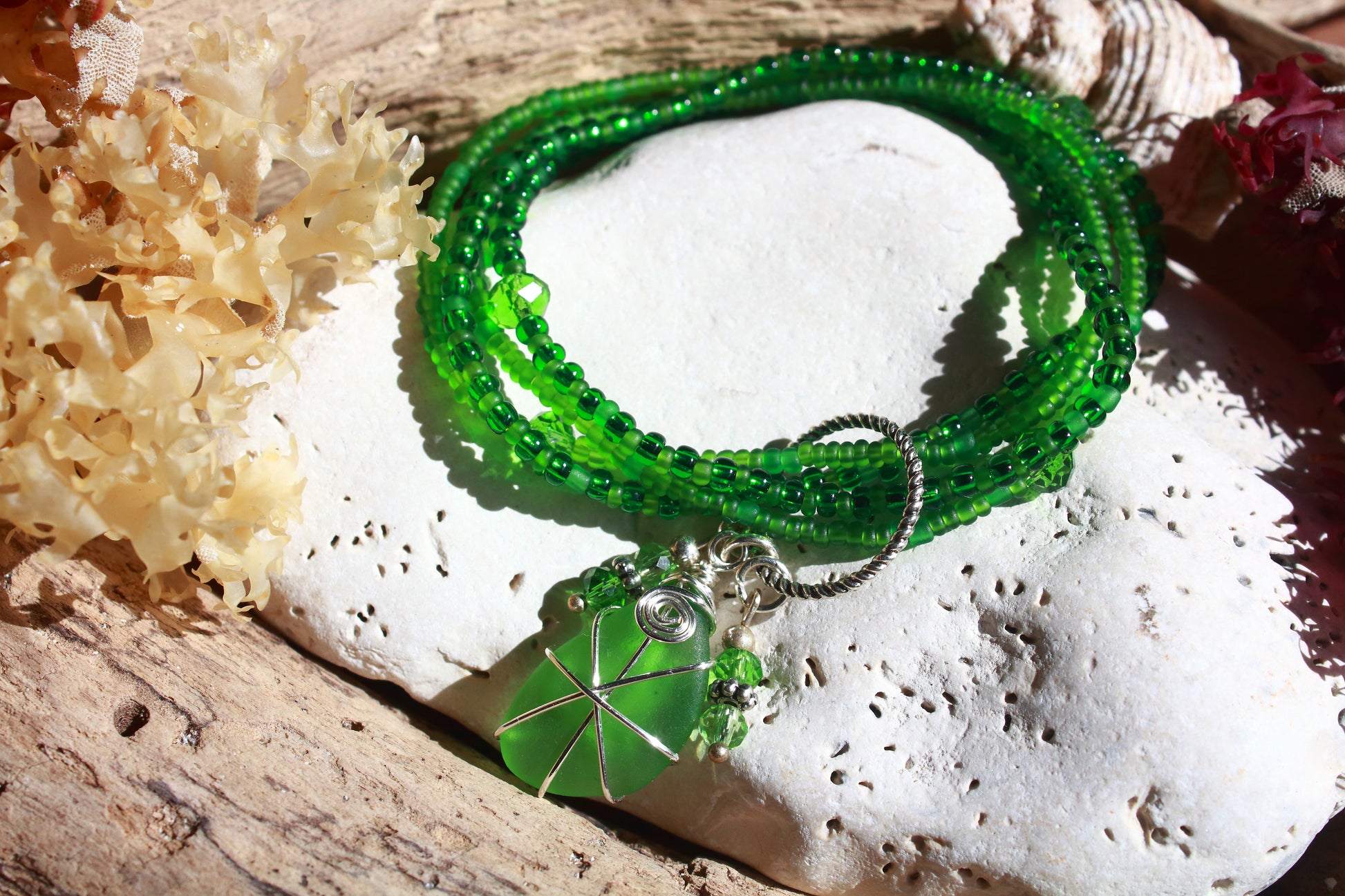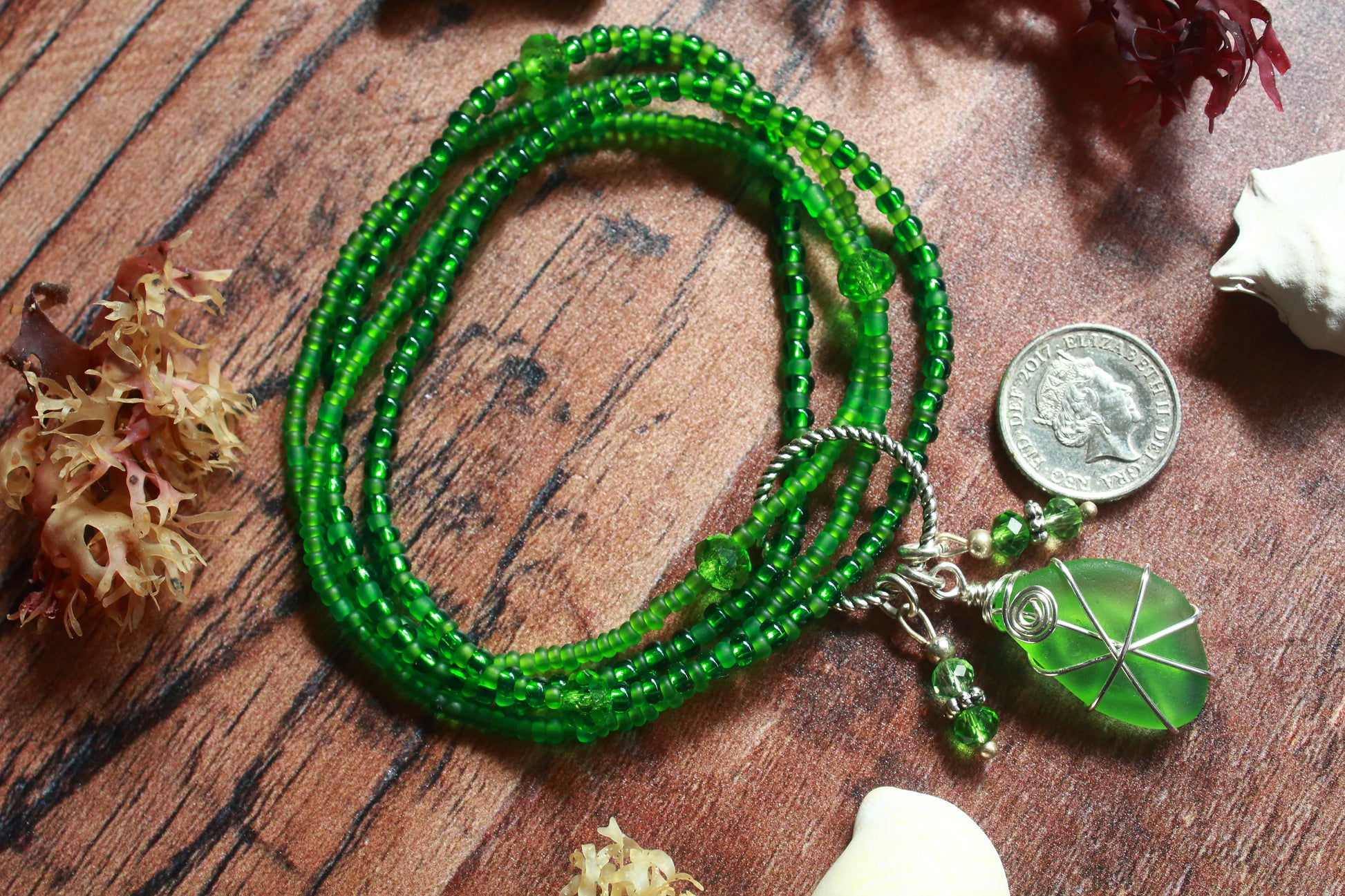 ~ Bright Kelly green glass beads, complimented by a piece of frosted green genuine Irish sea glass wrapped in silver plated wire.